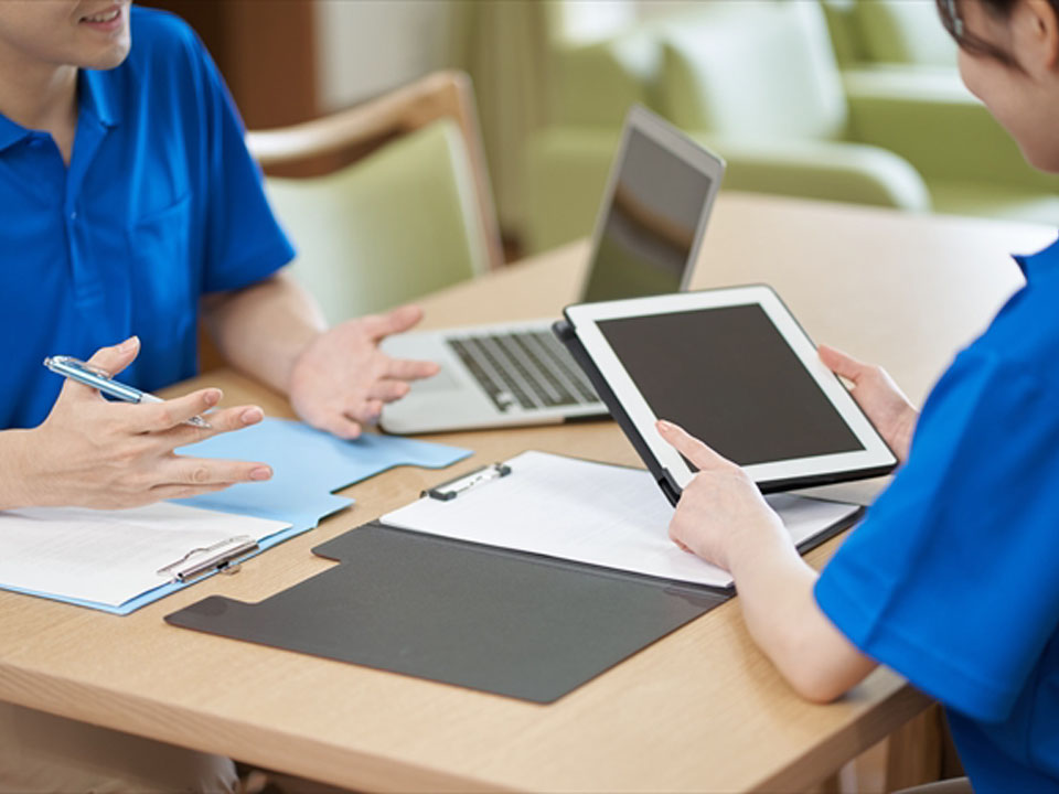 ご利用者様の情報がタブレットやスマートフォンで記録できるようになり、スタッフは必要な情報をすぐに確認ができます。紙の書類を探す手間がなく、記録も正確でスムーズ。チャットを使った情報共有で、担当者が変わっても「前回をわかってくれている」ケアが続きます。また、見守りセンサーなどのICT機器は夜間の転倒や急な変化にも早めに気づくことができ、ご家族の不安を和らげてくれます。